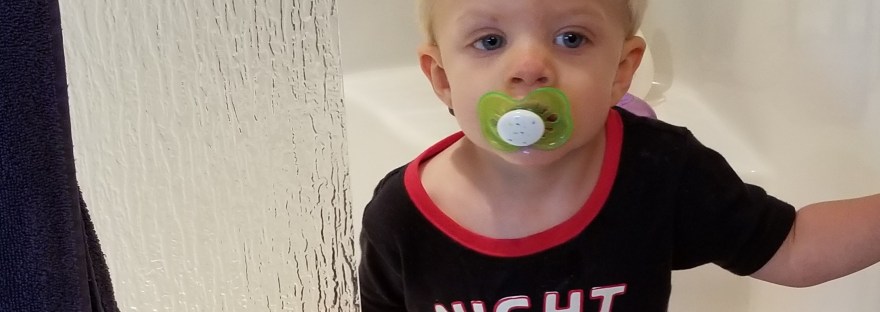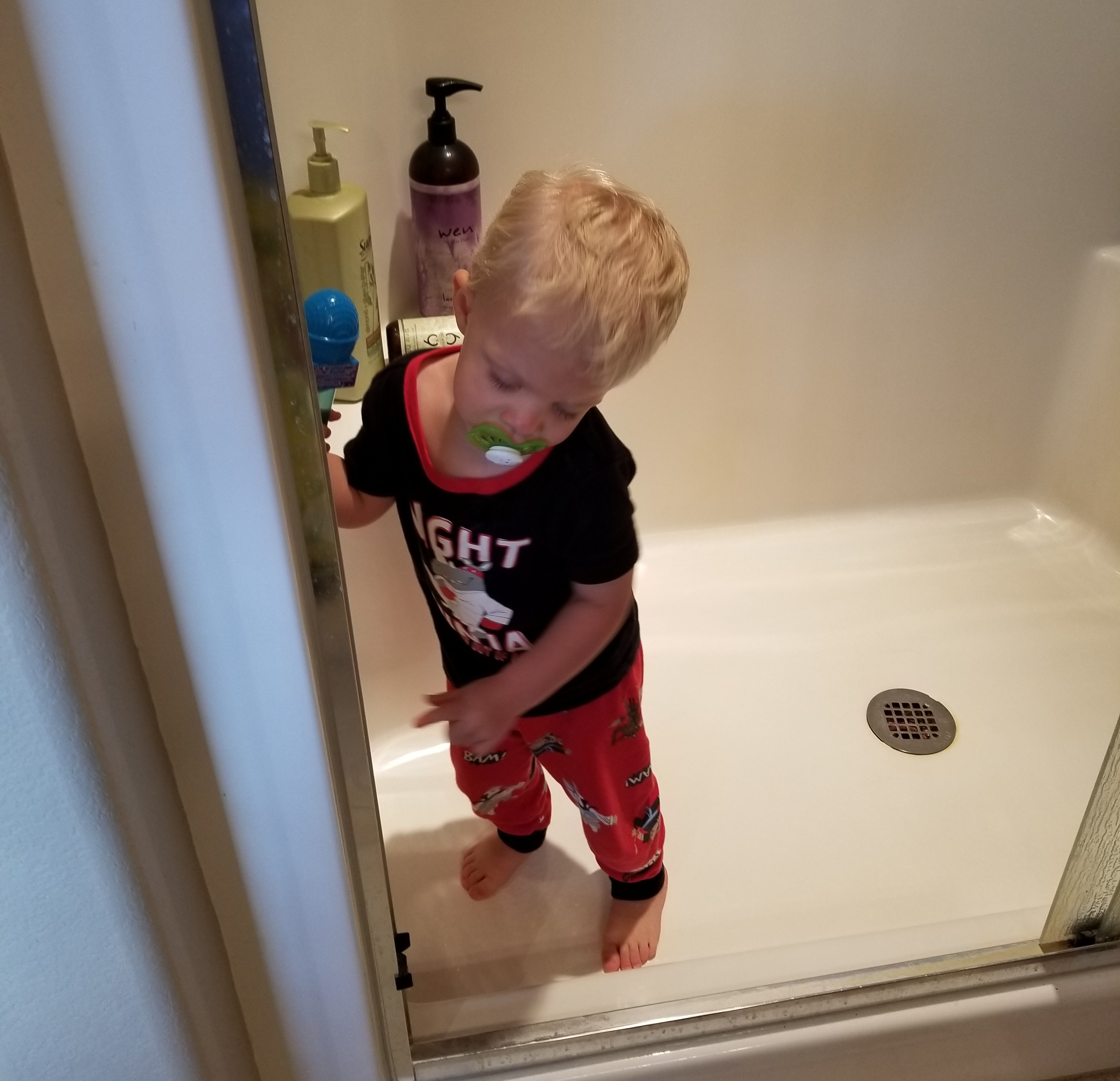 Little Q thoroughly enjoys playing in the shower, with or without the water on. This last weekend he was dancing from one side to the other which apparently includes opening and closing the doors. The laughter he spewed when I poked my head in or smooshed my face up to the glass made both of us laugh even harder.