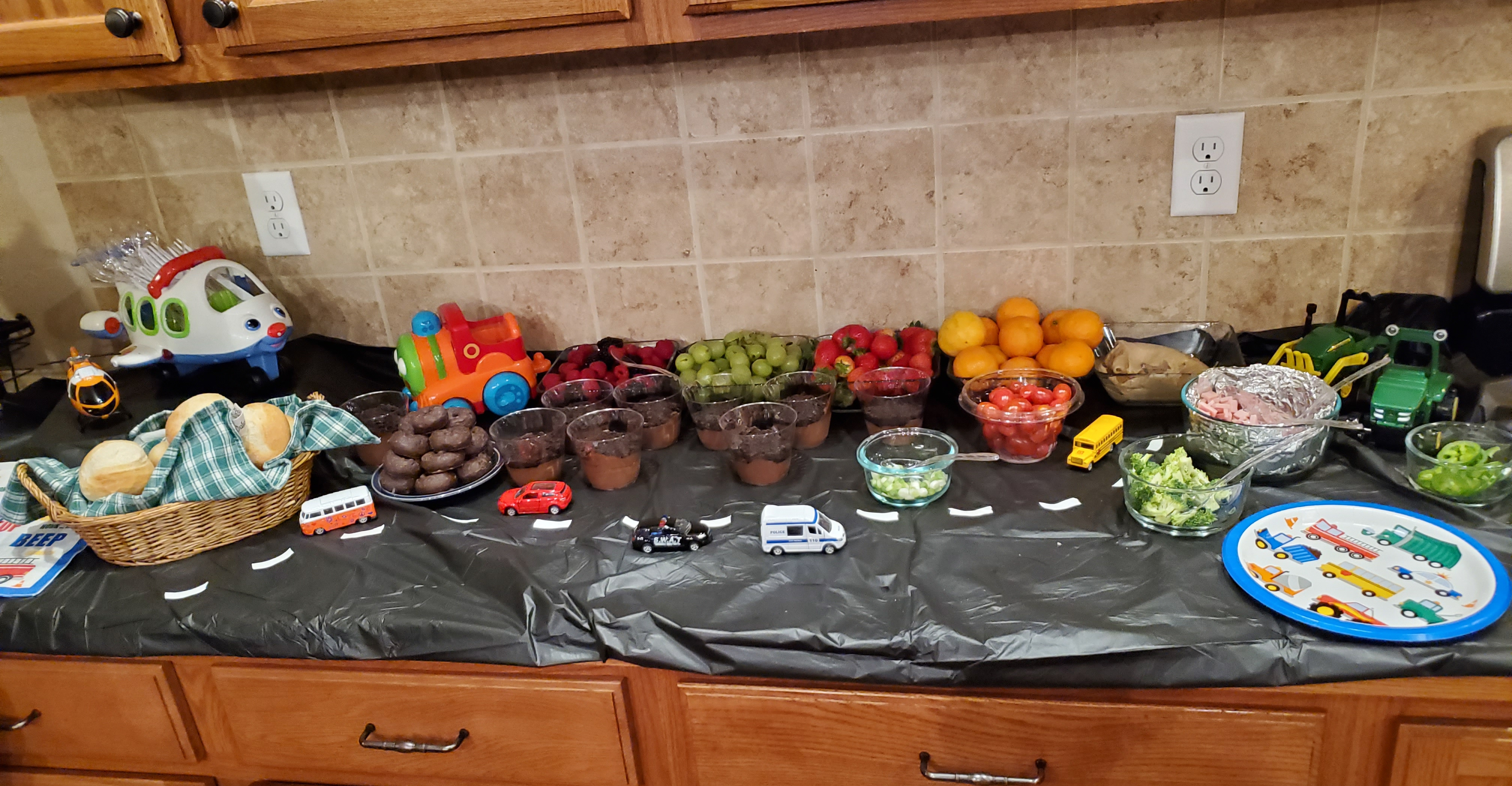 We did a transportation theme because Q appreciates anything that moves and/or makes noise and undoubtedly prefers the combination. The cake and decoration ideas where inspired by Pinterest and even though the signs didn’t get printed for “spare tires”, etc., no one else knew they were on my to-do list. I used Q’s toys, except a couple, and it worked out perfectly.