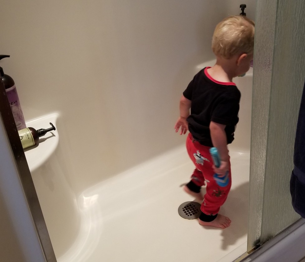 Little Q thoroughly enjoys playing in the shower, with or without the water on. This last weekend he was dancing from one side to the other which apparently includes opening and closing the doors. The laughter he spewed when I poked my head in or smooshed my face up to the glass made both of us laugh even harder.